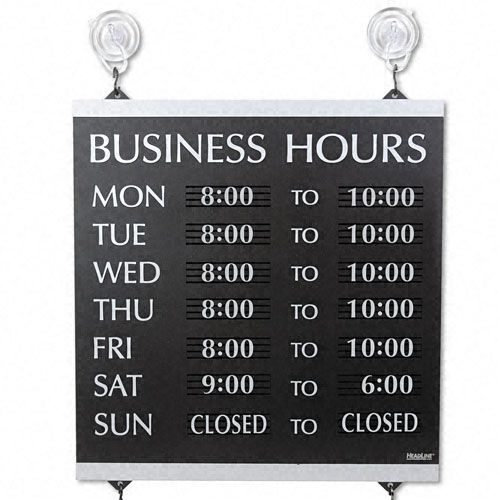 Overview U.S. Stamp & Sign Century Business Hours Sign, Heavy-duty plastic construction for durability. Includes 176 characters to designate hours of operation. Easily mounts on window with suction cups. Coordinates with and may be attached to Century Series Open/Closed sign. Global Product Type: Signs; Paper Type: N/A; Paper Color(s): N/A; Sign Type: Store/Business. PRODUCT DETAILS: -Message(s): Business Hours. -Height: 14 in. -Sign Type: Store/Business. -Global Product Type: Signs. -Post-Consumer Recycled Content Percent: 0 %. -Mounting: Suction Cups. -Border Color(s): Silver. -Pre-Consumer Recycled Content Percent: 0 %. -Width: 13 in. -Total Recycled Content Percent: 0 %. Package: Includes sign, 176 3/4" high silver plastic characters, and suction cups.