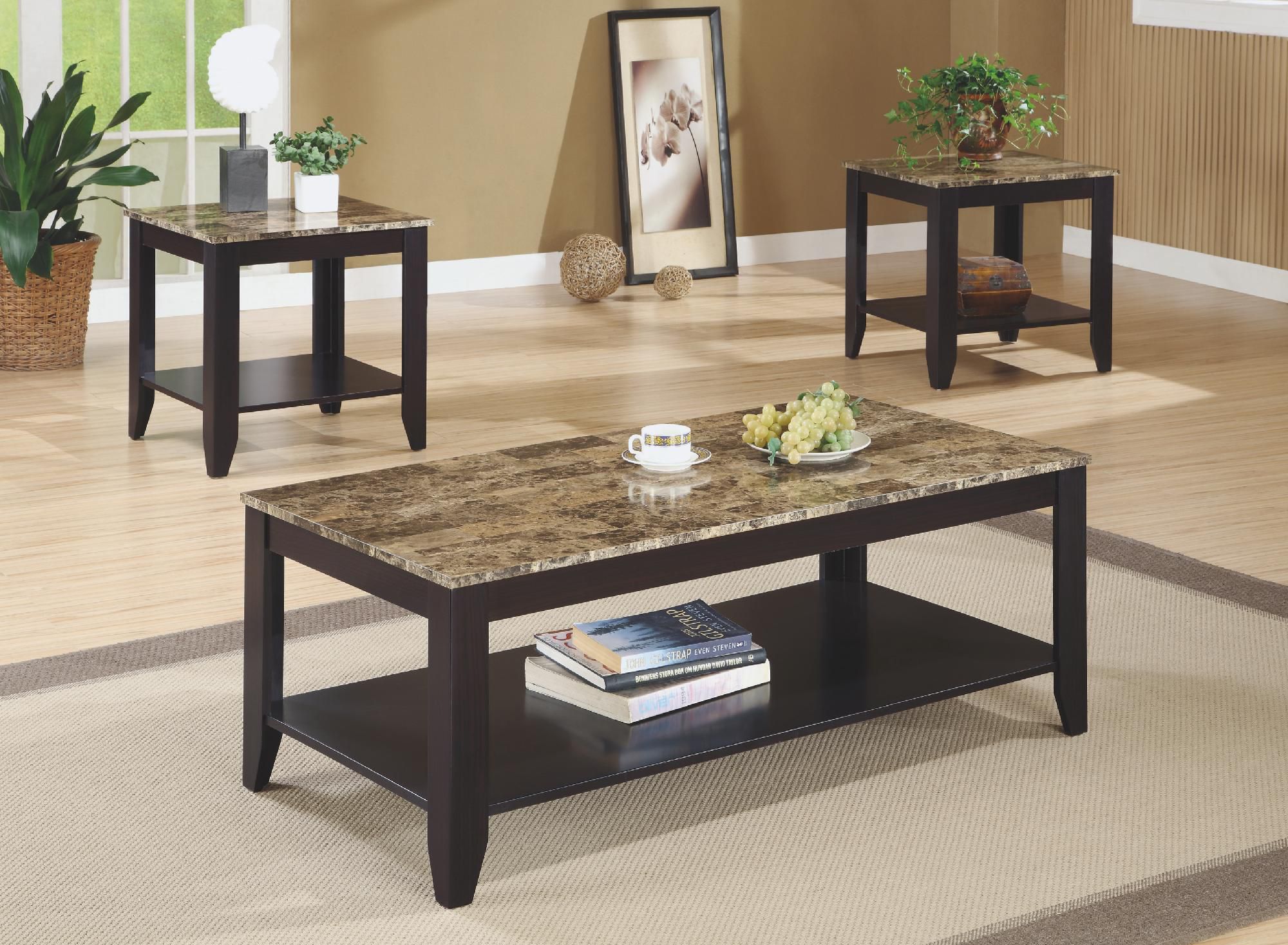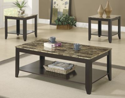 Make a statement in your living room with a three piece occasional table set that's sure to take center stage. This versatile accent table group includes a rectangular coffee table and two matching end tables that make a stylish addition to casual or contemporary decor. Marble look tops draw the eye with their muted shades of cream, onyx and gray and provide a durable yet beautiful surface for placing drinks and decorative accents. A sophisticated black finish wraps the base of the coffee and end tables, which feature lower shelves that offer additional space for storage or display. Tapered feet finish each piece and provide a sturdy foundation for lamps, potted plants and decor. Walnut Marble Like Top Coffee Table: L 47.62 W 23.62 H 18; Walnut Marble Like Top End Table: L 22 W 20 H 22.