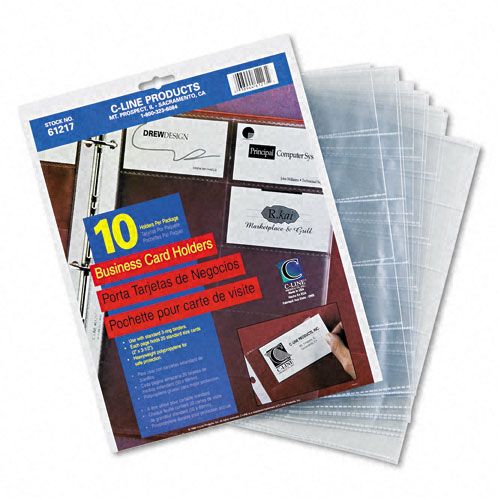 where can I buy C-Line Business Card Holders - C-LINE PRODUCTS, INC. Heavyweight polypropylene pages with reinforced binding edge hold your important business cards for easy reference while at the office or on the road. Pages fit standard three-ring binders. Side load sleeves. Each page holds 20 business cards. Card File Refills Type: Business Card Binder Page; Global Product Type: Card File Refills-Business Card Binder Page; Card Size (W x H): N/A; For Card Size: 2 x 3 1/2.PRODUCT DETAILS: -Card Capacity: 200. -Height: 11 1/4 in. -Global Product Type: Card File Refills-Business Card Binder Page. -Post-Consumer Recycled Content Percent: 0 %. -Material(s): Polypropylene. -For Card Size: 2 x 3 1/2. -Color(s): Clear. -Pre-Consumer Recycled Content Percent: 0 %. -Width: 8 1/8 in. -Total Recycled Content Percent: 0 %. -Card File Refills Type: Business Card Binder Page. Package: Includes 10 protectors.