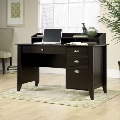 Shop for Desks from ComputerDesks.com! The Sauder Shoal Creek Writing / Laptop Desk with Hutch exemplifies succinct traditional style and attracts admirers with a rich espresso finish and nickel-plated hardware. Laminate over engineered wood (MDF) construction is more than capable of any task you have to send its way. Two storage drawers, one full-length shelf, three cubbyholes, and one letter-size hanging file drawer appease the space conscious. A wire management grommet reduces work surface clutter. About SauderSauder is North America's leading producer of ready-to-assemble (RTA) furniture and the nation's fifth largest residential furniture manufacturer. Based in Archbold, Ohio, Sauder also sources furniture from a network of quality global partners, including a line of office chairs that complement its residential and light commercial office furniture. Sauder markets more than 30 distinct furniture collections in a full line of RTA furnishings for the home, entertainment, home office, bedroom, kitchen, and storage. Sauder is a privately held, third-generation, family-run business. The company prides itself on its awareness that all function and no fashion makes for a dull living space when it comes to home furnishing products. That's why Sauder's award-winning design team has produced more than 25 collections of stylish furniture that span the design spectrum. From minimalist modern or contemporary to classic 18th century or country styles, Sauder has what you're looking for. The company offers more than 500 items - most priced below $500 - that have won national design awards and generated thousands of letters of gratitude from satisfied consumers.