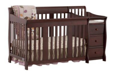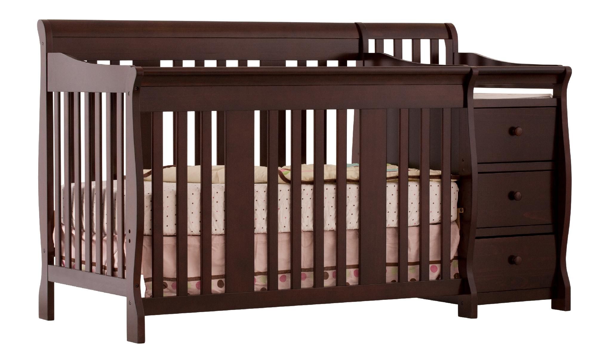 The beautiful solid construction of the Portofino 4 in 1 Fixed Side Convertible Crib Changer by Stork Craft, with its magical sleigh design, makes this a royal centerpiece for your nursery. All four sides are stationary and include an adjustable three position mattress support base to add to the security and stability of this versatile crib. It has a well built construction made of solid wood and wood products, offered in a selection of non toxic, durable finishes. Designed for multiple stages of life; it converts from a full size crib to a toddler bed, to a daybed, to a full-size bed (bed rails not included). The attached changer is designed with safety in mind, with an extra deep surface for added security and stability while changing your baby. Complete your nursery look by adding an assortment of matching accessories: a chest, dresser or glider and ottoman by Stork Craft. Set-up this extravagant piece effortlessly with it s easy to follow directions into a crib that s perfect for your babies sweet, delicate slumber.
