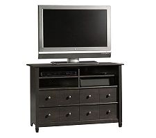 Sauder - TV Stands - 409242 - The clean lines of the Edge Water Collection bring a new spin to cottage style. In keeping with the relaxed sophistication of the collection, each piece is detailed with solid wood sculpted tapered feet, distinctive kick rails, elegant dark Spanish hardware and shapely soft framed doors and drawers. Finished in an elegant Estate Black finish with a warm gold undertone, and designed with a great attention to modern function and storage, Edge Water creates a relaxed oasis that still serves today's mobile technology lifestyle. Highboy TV stand Edge Water collection Estate black finish Holds TVs weighing 70 lbs Two adjustable shelves for audio and video equipments Four drawers with metal runners and safety stops Patented T-lock assembly system Assembly required Manufacturer provides 5 year warranty Specifications: Overall dimensions: 30.827 H x 44.567 W x 17.48 DWeight: 113 lbs.